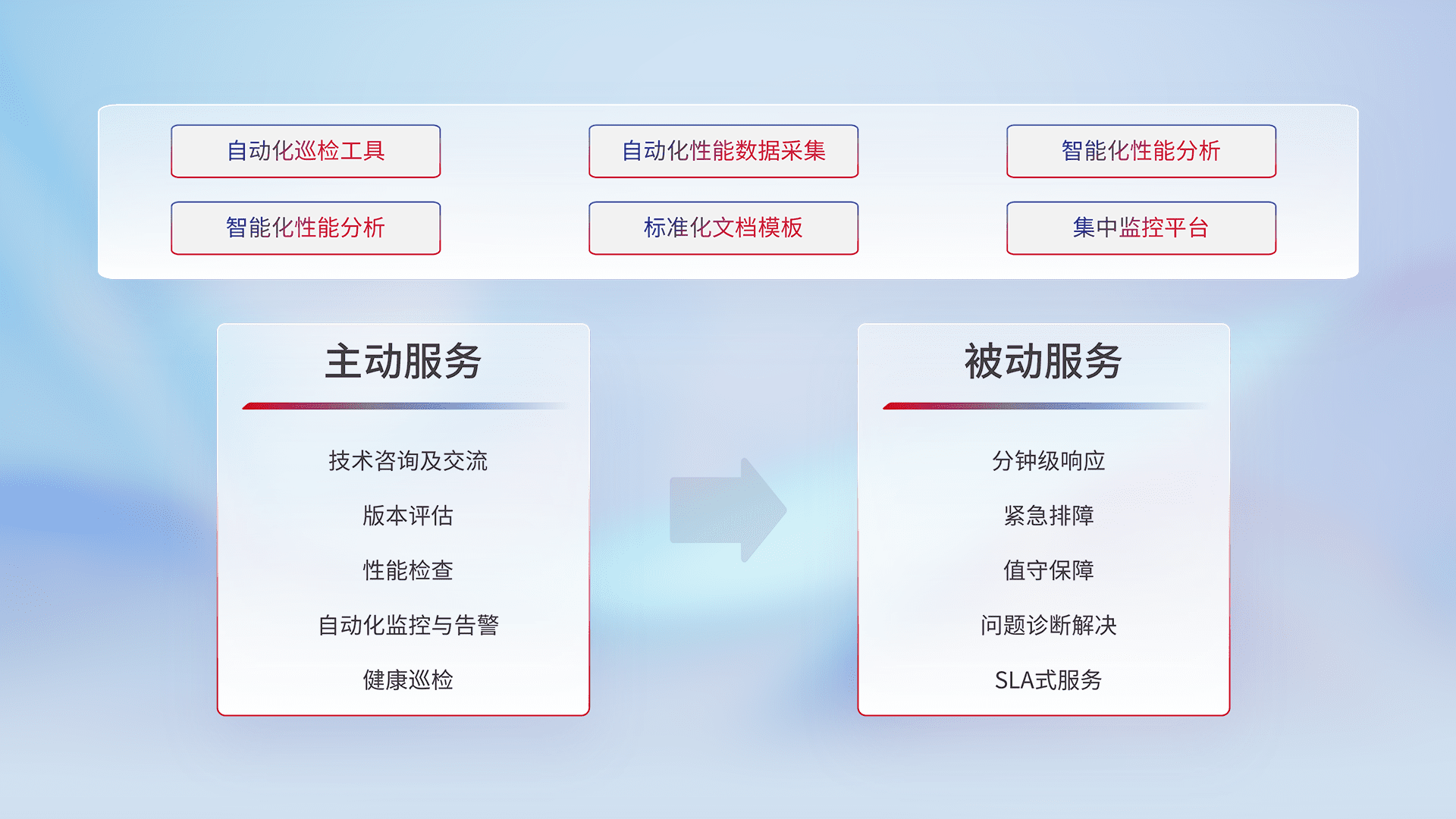 智能化工具和标准化文档,,,保障服务质量,,提供主动服务(包含技术咨询、、版本评估、、、、性能检查、、、自动化监控与告警、、、、健康巡检)和被动服务包含(分钟级响应、、、紧急排障、、、值守保障、、问题诊断解决、、、SLA服务)。。。